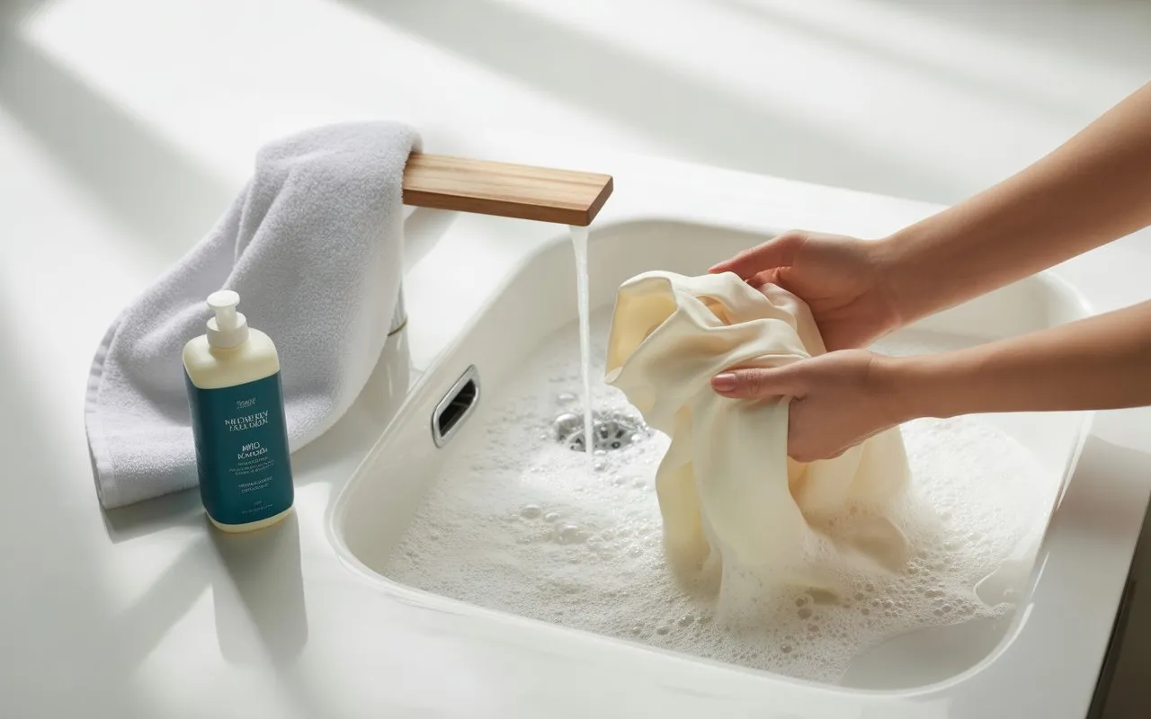 Clean the sink first, fill it with cool to lukewarm water, add a small amount of mild detergent, swish the garment gently, rinse it thoroughly, then press out water and air-dry it properly.